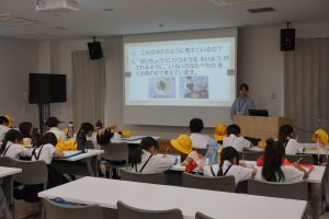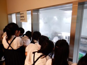 6月10日に善通寺市立東部小学校の2年桜組、13日に2年梅組がセンター見学に来てくれました。学校栄養職員の先生から給食ができるまでのお話を聞いた後、実際に作っているところを見学用窓から見て、いろいろなことを発見することができました。また体験コーナーでは、2年生の背の高さと同じくらい大きなお玉やスパテラを持って、かき混ぜたりつぎ分けたりする体験をしました。自分たちが食べている給食がどのように作られているのかを知ったことで、見学後の給食では、給食を意欲的に食べようと頑張る姿が多く見受けられたようです。