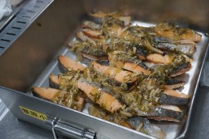 給食では和風あんの中にしめじを入れたものを鮭にかけて提供しました。小さいぶなしめじだったため、味がよくなじみキノコ類が苦手な児童も1個からチャレンジすることができていました。「もったいない」を減らしたいので、また給食で食べたいという児童もいました。