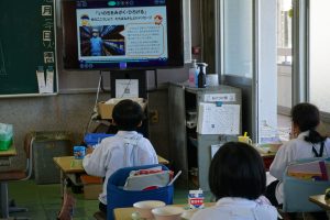 学校では取材内容を盛り込んだ動画を見ながら給食を食べました。ぶなしめじが栽培されている様子はとても興味を引いたようです。規格外のぶなしめじが廃棄されると聞いて「もったいない!」という声もあがりました。