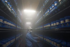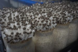 ぶなしめじは自然の中では木の根元に生えていますが、人工的に栽培するときは瓶状の培地にぶなしめじの種となる菌を植え付けて栽培します。この培地はとうもろこしの芯を砕いたものに、ぶなしめじが大きくなるための肥料等が入っています。培地の瓶はきれいに並べられて温度や湿度、二酸化炭素の濃度、風量、光量などを調節することのできる部屋の中で育てられます。特に光は独自に開発された特殊な光を使っていて、光をあてることで茎を太く大きくし、かさの色づきをよくすることができるそうです。