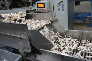 カットしめじの製造工程では、しめじを機械でカットしたあと、人が目視し、ほぐしながらコンベアで送られていきます。よく見るとローラー状になっているコンベアの隙間から小さいぶなしめじがふるい落とされています。大きすぎるものや小さすぎるものは規格外となり、残念ながら商品にはなりませんでした。しかし、香川第一きのこセンターではこの規格外のぶなしめじを業務用として特別に注文を受け付けており、この機会に給食で使用しSDGsにつなげたいと考えました。
