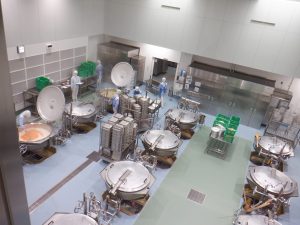 スクリーンに映ったセンターの概要を聞いた後、大きな窓から調理場を見学します。調理員さんが手を振ってくれたり、大きな鍋から湯気が立ったりすると「わあ!」と歓声が上がり、「すごい!」「大きいね」と友達と感想を言い合っていました。