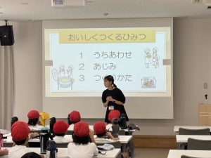 また、実際に調理場の中で使用している器具を持ってみて、その大きさや重さを体験することもできました。普段はなかなか気づかない給食ができるまで、そして給食を食べた後の話を聞いた園児や児童は「味わって食べたい」「こんなに大変だとは知らなかった」と多くの発見があったようです。