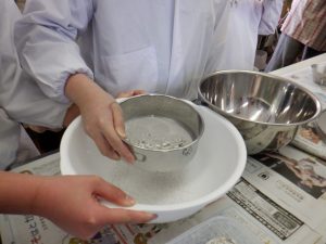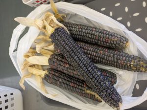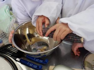 次に、サニーレタス農家の大西さんです。サニーレタスだけでなく、いろいろなものを栽培している大西さんには、今回与北小学校で「ホピブルー」という品種のとうもろこしを使ってタコス作りを依頼しました。学習では、乾燥させたホピブルーを芯からはずし、粉砕してふるいにかけて粉にする体験とタコスの生地を伸ばして焼き、具をはさんで食べる調理体験を行いました。