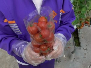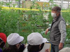 はじめは、ミニトマト農家の平尾さんです。与北小学校の児童がミニトマトを育てているビニールハウスにお邪魔して、収穫体験を実施しました!