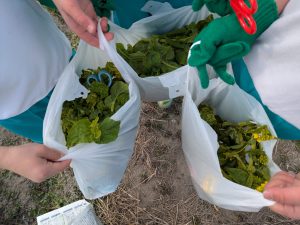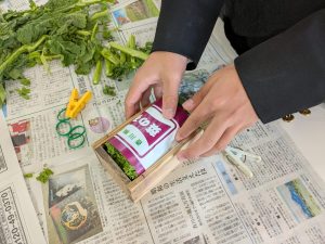 出荷作業は、琴平小学校2年生、象郷小学校2年生、琴平中学校1年生が体験しました。作った束を一人ひとついただき、袋に入れている子どもたちに「ちぎった葉っぱもおいしいよ」と声をかけると「もったいないから持って帰る!」と袋につめる姿が印象的でした。