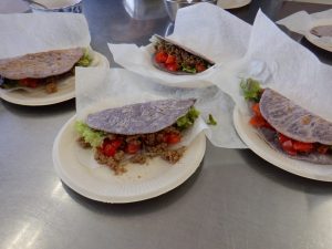 次に、サニーレタス農家の大西さんです。サニーレタスだけでなく、いろいろなものを栽培している大西さんには、今回与北小学校で「ホピブルー」という品種のとうもろこしを使ってタコス作りを依頼しました。学習では、乾燥させたホピブルーを芯からはずし、粉砕してふるいにかけて粉にする体験とタコスの生地を伸ばして焼き、具をはさんで食べる調理体験を行いました。