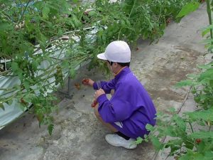 はじめは、ミニトマト農家の平尾さんです。与北小学校の児童がミニトマトを育てているビニールハウスにお邪魔して、収穫体験を実施しました!