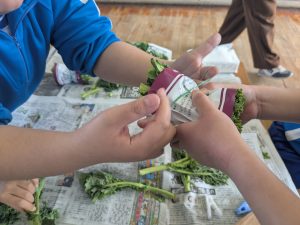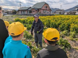 最後に、菜花農家の三好さんです。毎年実施している菜花の出荷体験や収穫体験をさせていただくことができました。給食や家で普段何気なく食べている野菜がどのような方法で、どのようなことに気を付けて作られているのかを直接聞くことで、どれだけ大切に育てられているのかに気づく子どもが多くみられました。
